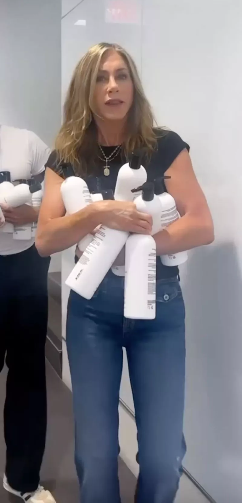Not only that, but Aniston’s black shirt gives the standard top and jeans combo both a bit of an edge and touch of femininity, thanks to its color and delicately situated shoulders, respectively.